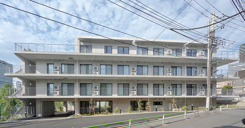 The building features an exterior of exposed concrete, with clean horizontal balcony lines that reduce any sense of visual pressure and harmonize with the surrounding neighborhood.