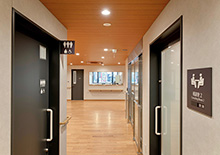 The main entrance, serving as the face of the facility, features walls with cedar board formwork, and a community center is positioned to the right, visible from outside. The community center includes a wooden deck terrace, providing a space where residents can meet their beloved pets. Designed during the COVID-19 pandemic, the consultation room was planned to allow isolation and direct access from outside, enabling family visits even under entry restrictions. The entrance hall is finished with real wood flooring and ceilings, creating an interior that harmonizes wood and concrete.