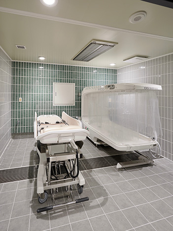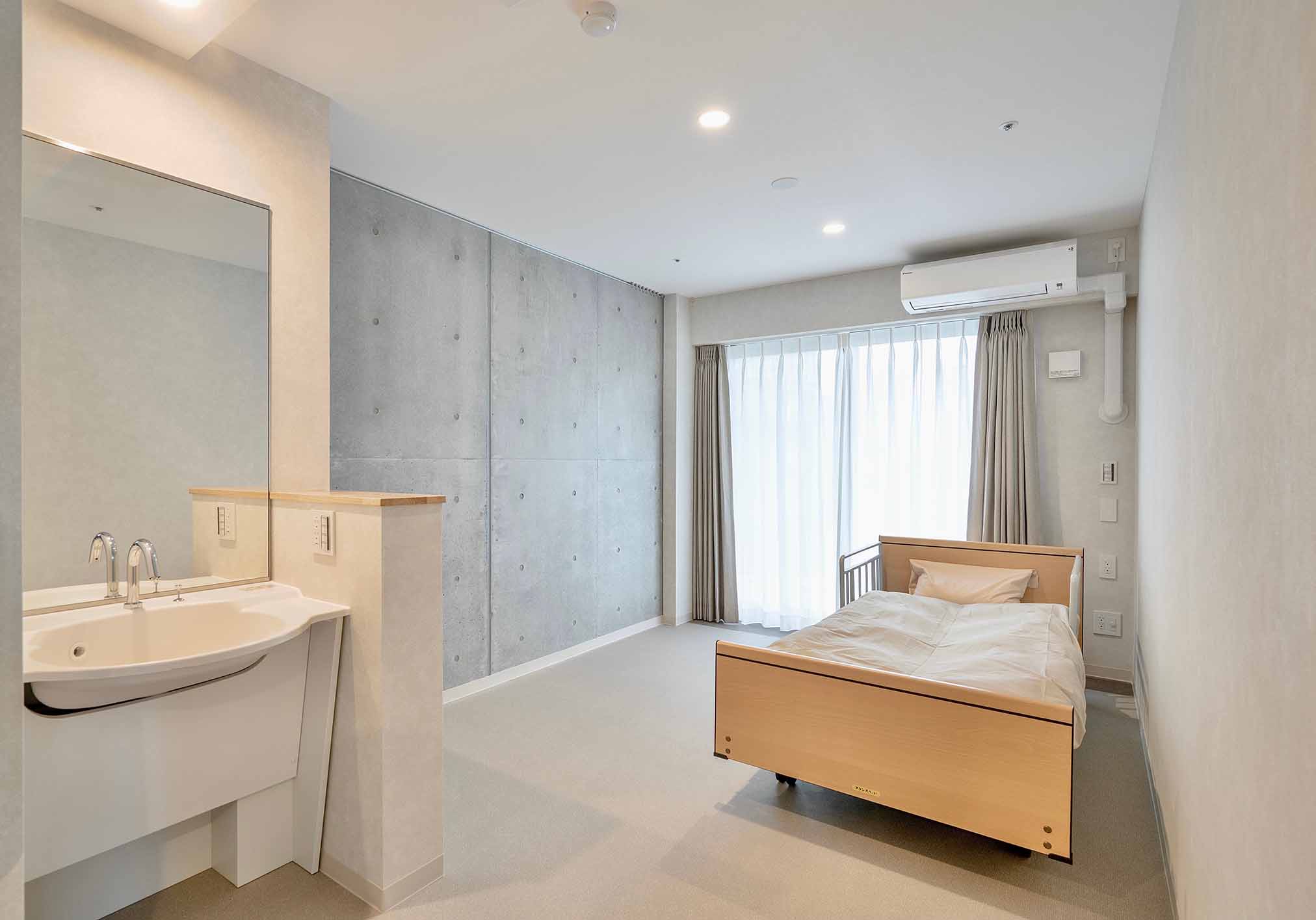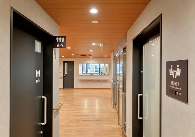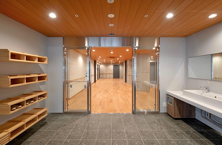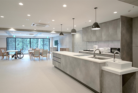 施設の顔となるエントランス正面は杉板型枠の壁面とし、正面右手の外部から視認できる場所には地域交流センターを配置した。地域交流センターにはウッドデッキのテラスを設け、入居者が愛犬と面会できる場としている。設計時はコロナ禍であったため、家族の入室が制限された場合にも面会できるよう、相談室を隔離可能とし、外部から直接出入りできる工夫を施した。エントランスホールは無垢材の床・天井仕上げとし、木とコンクリートの調和を図ったインテリアとしている。